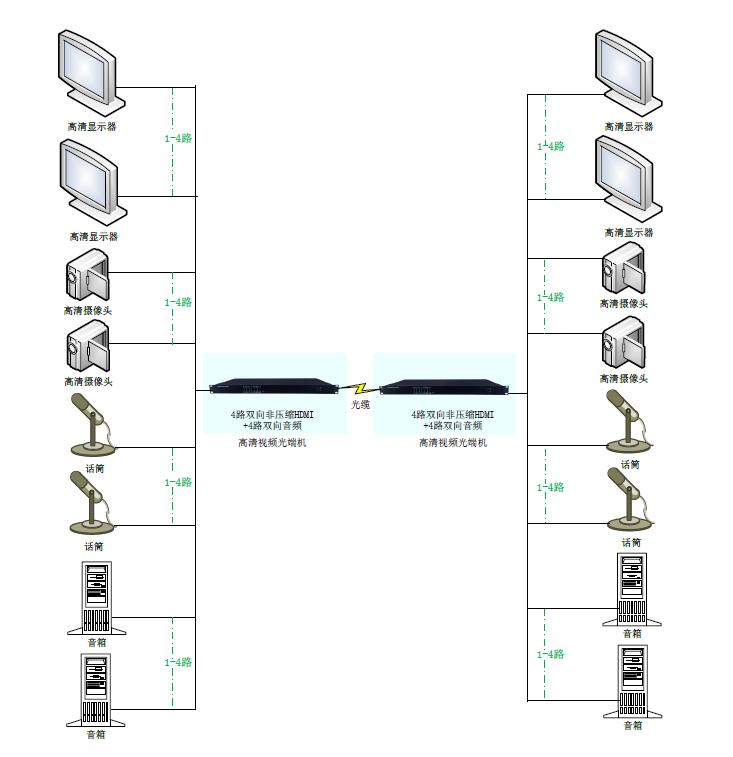 4路雙向非壓縮HDMI+4路雙向音頻高清數字光端機是北京聖鈞科技發展有限公司採用自主知識産權的大規模集成電路研發産品,通過一芯單模光纖傳輸1路雙向無壓縮HDMI、1路雙向音頻、百兆以太網、電話、磁石、數據等業務。 在多媒體應用系統中,往往需要把HDMI數字視頻信号、音頻信号、控制信号進行遠距離、無失真的並行傳輸。但使用普通的電纜長距離傳輸時,總會出現輸出信号差,容易受幹擾,顯示出來的圖像會出現模糊、拖尾、分色等現象。同時傳輸距離短,要多條電纜才能同時傳輸這些信号,不能滿足多媒體信息發布等場合長距離傳輸的要求,使用HDMI光端機進行傳輸,完全解決瞭此類問題,傳輸距離1米-80公裏。同時,光端機傳輸具有衰減小、頻帶寬、抗幹擾性能強、安全性能高、體積小、重量輕等優點,所以在長距離傳輸和特殊環境等方面具有無法比拟優勢。