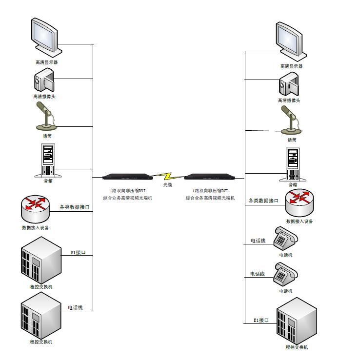 在光纖上傳輸1路雙向非壓縮DVI+1路雙向音頻+2路百兆網絡+1-16路電話、磁石等業務, 1U機架式設備 |