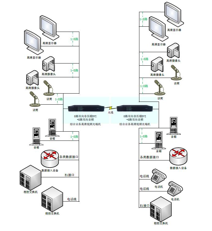 在光纖上傳輸8路雙向非壓縮DVI+8路雙向音頻+百兆網絡或千兆+1-32路電話磁石等業務+4-16E1等,2U機架式設備 |